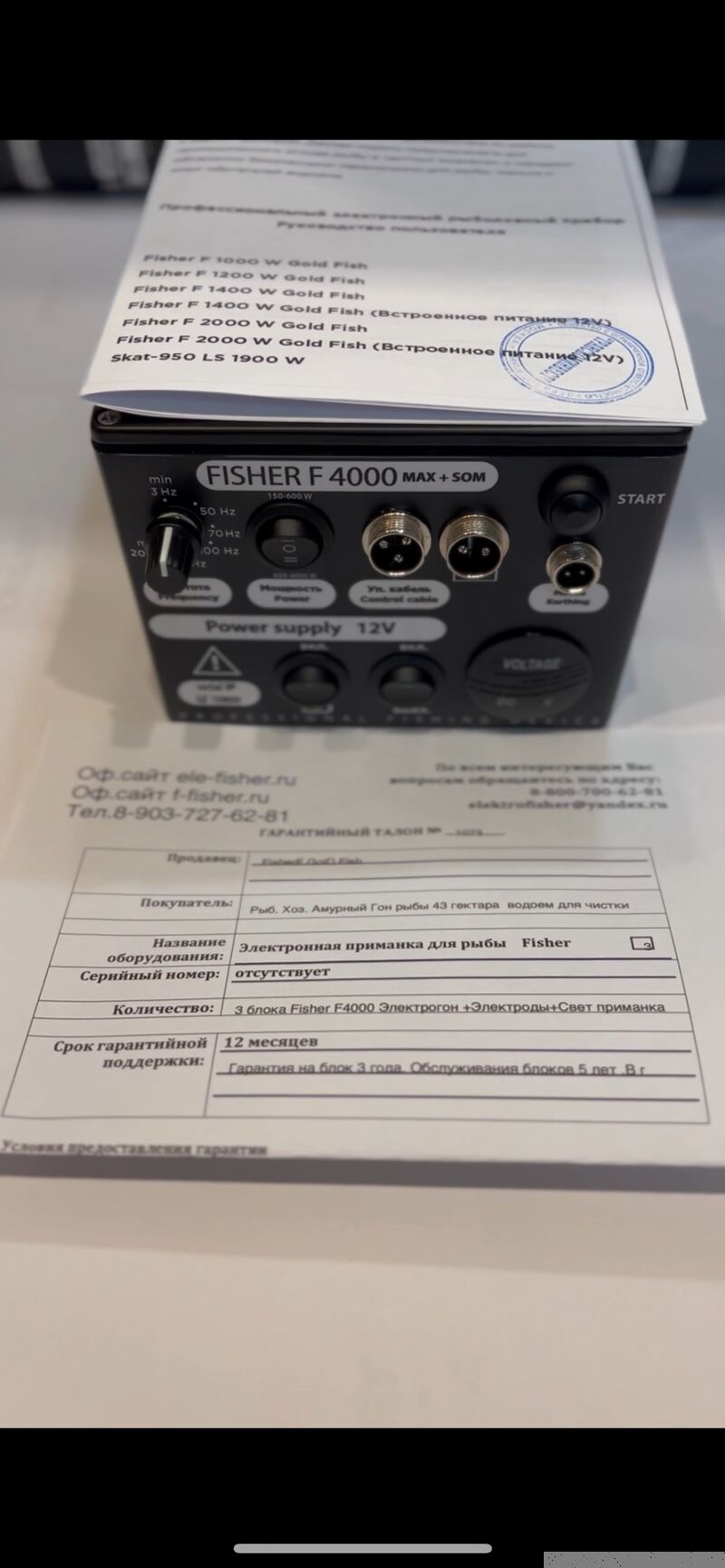 - Осуществляем продажу профессионального заводского оборудования для РыбХоза и рыбооазведенческих станций В наличии все модели в полной комплектации Здравствуйте! В Наличии ! Электрогоны Fisher Fisher F Gold Fish с 1999 года Fisher F 1200 -50000 1,5 м (55000) Fisher F 1400 -55000 (65000) 2 м Fisher F 2000 -60000(70000) 2,5 м Fisher F 3000 -70000(80000) 3-4 м Fisher F 3500 -79000 5-7 м Fisher F 4000 -85000 (89000)8-10 м Fisher F 4000 -99000 (115000)MAX+ SOM 10-12м Fisher F 4000 -115000 (130000)MAX+SOM (подсак ) Fisher F 4000 -125000 (150000)МAX + SOM+(встроенное питание ) Fisher F 4000 -135000 (185000)MAX + SOM (встроенное питание )(Ситстема Электрогон )(электроды )(подсак ) + 2